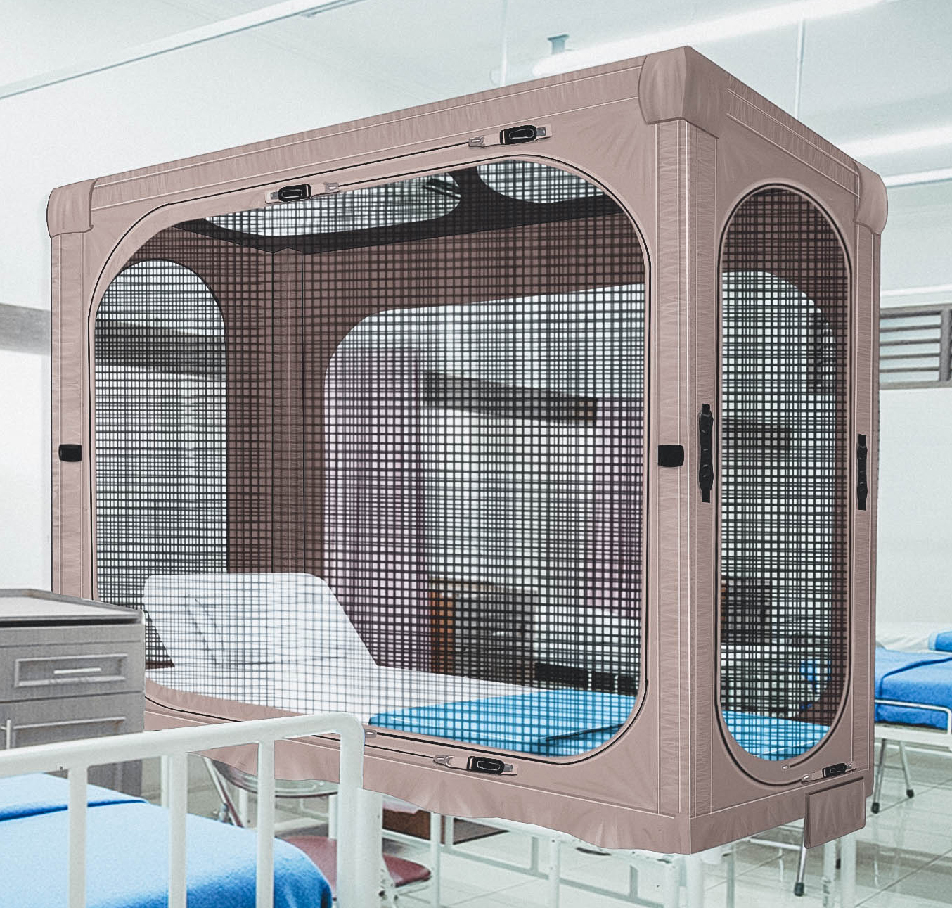 A protective solution for patients who have to stay in bed. Easy to operate from outside for the caregiver. Many technical solutions in zippers and magnets. A seamless finish for patient safety.